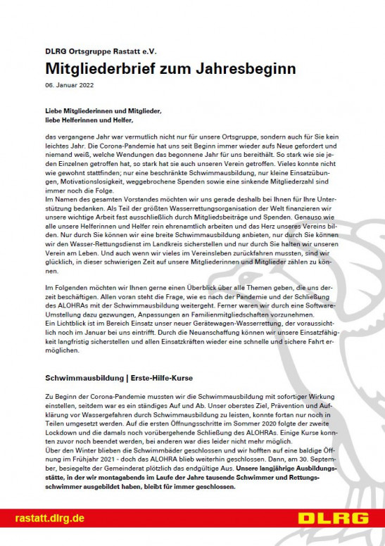 Liebe Mitgliederinnen und Mitglieder, liebe Helferinnen und Helfer, das vergangene Jahr war vermutlich nicht nur für unsere Ortsgruppe, sondern auch für Sie kein leichtes Jahr. Die Corona-Pandemie hat uns seit Beginn immer wieder aufs Neue gefordert und niemand weiß, welche Wendungen das begonnene Jahr für uns bereithält. So stark wie sie jeden Einzelnen getroffen hat, so stark hat sie auch unseren Verein getroffen. Vieles konnte nicht wie gewohnt stattfinden; nur eine beschränkte Schwimmausbildung, nur kleine Einsatzübungen, Motivationslosigkeit, weggebrochene Spenden sowie eine sinkende Mitgliederzahl sind immer noch die Folge. Im Namen des gesamten Vorstandes möchten wir uns gerade deshalb bei Ihnen für Ihre Unterstützung bedanken. Als Teil der größten Wasserrettungsorganisatio ... Mehr erfahren