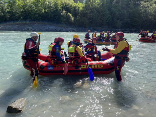 Fortbildung für Strömungsretter aus dem ganzen Bundesgebiet in Österreich. Zu einem viertägigen Lehrgang mit dem Thema Rafting trafen sich vom 26. - 29.05.2022 über 20 Teilnehmer*innen des Moduls Rafting in der Gemeinde Imst in Österreich. Mit dabei war auch ein Mitglied unserer Ortsgruppe, das dabei viele neuen Eindrücke und Erfahrungen mitnehmen konnte. Unter der Leitung von Mathias Leise, Bundeausbilder Strömungsrettung in der DLRG, lernten die Teilnehmer*innen das Führen eines Rafts im Einsatz. Voraussetzung für die Ausbildung zum Raftführer in der DLGR ist dabei die Qualifikation als Strömungsretter, die jeder Absolvent vorzuweisen hatte. Die Praxisteile des Lehrgangs fanden auf dem Inn statt, der an der Stelle bei Imst einem Wildwasser der Katergorie 2-3 entspricht. Das Führen ... Mehr erfahren