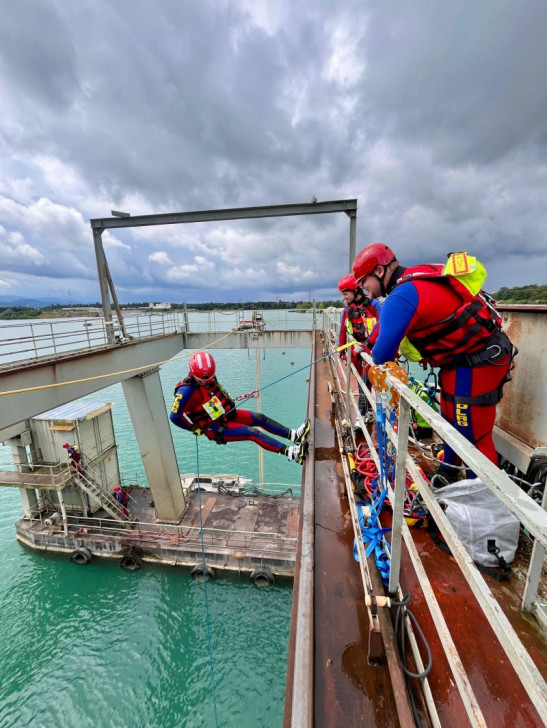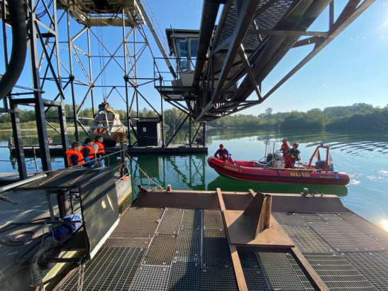 Strömungsretter aus dem Bezirk Mittelbaden trainieren an Schwimmbagger Aktiv-Aktiv und Aktiv-Passiv, das sind die beiden Varianten des Standardverfahrens "Abseilen" in der Strömungsrettung der DLRG. Bei wechselhaftem Wetter wurden am Samstag, den 22.07.2024 am Kühlsee in Baden-Baden-Sandweier beide Varianten von sechs Strömungsrettern aus Mittelbaden ausführlich trainiert. Während sich die Person im Seil bei der Abseilvariante Aktiv-Aktiv komplett selbst sichert, wird bei der passiven Methode eine zusätzliche Sicherung von oben fixiert. In beiden Varianten geht es darum, möglichst schnell und sicher Höhe zu überwinden. Schauplatz der Übung war ein Schwimmbagger des Kieswerkbetreibers EKS Eugen Kühl, der zwei verschiedene Ebenen mit Höhen bis etwa 12 Meter bietet. Von dort wurde insbeson ... Mehr erfahren